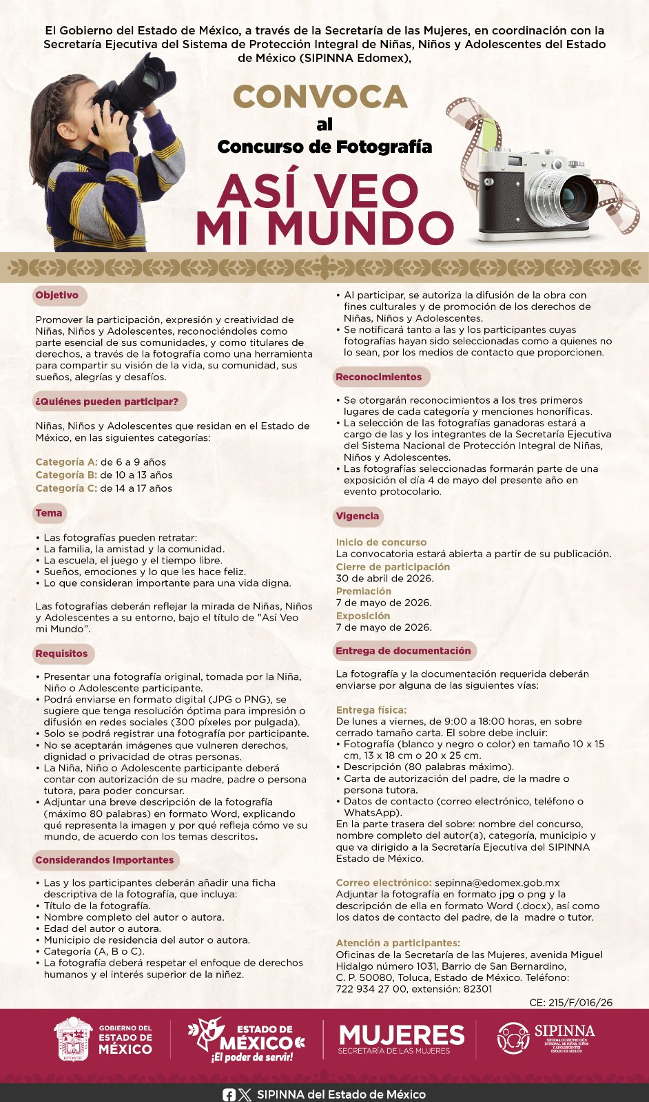 La fecha límite de participación es el 30 de abril 2026. Las bases completas se encuentran en la página web y redes sociales de la Secretaría de las Mujeres: https://semujeres.edomex.gob.mx/sites/semujeres.edomex.gob.mx/files/files/convocatoria-sipinna/concurso-de-fotografia.pdf.