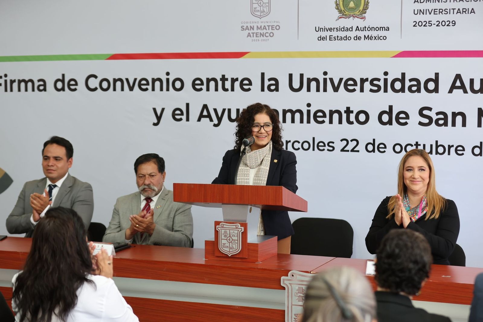 Por su parte, la presidenta municipal de San Mateo Atenco, Ana Aurora Muñiz Neyra, celebró la firma de este convenio como una oportunidad para fortalecer la vocación productiva del municipio. Destacó que cerca de 88 por ciento de su gabinete está conformado por egresados de la UAEMex, lo cual –dijo– refleja el compromiso de la comunidad universitaria con la transformación social.