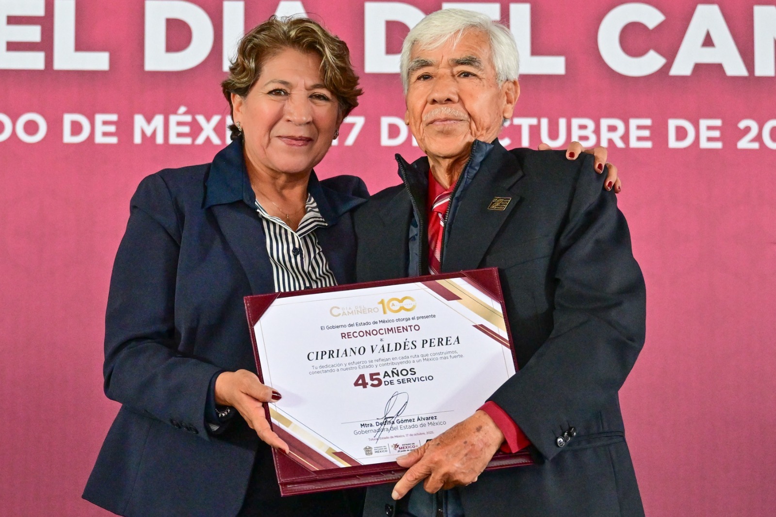 Durante esta celebración, en la que se rindió tributo a un siglo de dedicación a la infraestructura vial, la mandataria estatal relevó la placa conmemorativa “Centenario del Día del Caminero” y entregó reconocimientos a trabajadores de la Junta de Caminos del Estado de México por hasta 45 años de servicio. También se guardó un minuto de silencio por los camineros caídos este año en el cumplimiento de su deber.