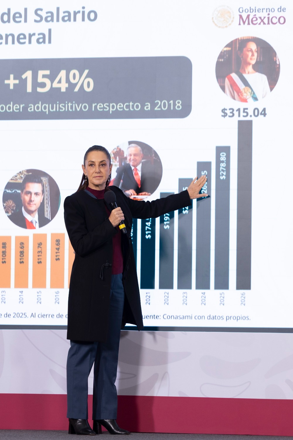 Puntualizó que este crecimiento en la clase media se debe a que en el modelo de la transformación se construye una nueva política social y de derechos, bajo el pensamiento humanista de “por el bien de todos, primeros los pobres”, así como a través de los Programas para el Bienestar que pasarán de una inversión social de 845 mil millones de pesos (mdp) en 2025 a un billón de pesos en 2026. Aunado a que en materia laboral se ha incrementado el salario mínimo de 197 pesos diarios en 2022 a 260 pesos en 2024. Y a partir del 1 de enero de 2026: de 315.04 pesos diarios a nivel general y de 440.87 pesos diarios en la Zona Libre de la Frontera Norte (ZLFN).