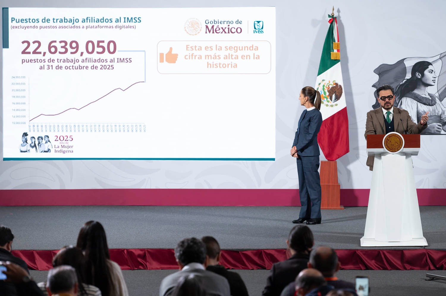El Instituto Mexicano del Seguro Social (IMSS) informó en la conferencia matutina de la presidenta Claudia Sheinbaum Pardo que, al 31 de octubre de 2025, se registraron 22 millones 639 mil 50 puestos, la segunda cifra más alta en la historia desde 1997, año en el que inició esta medición; la primera se registró en noviembre de 2024.