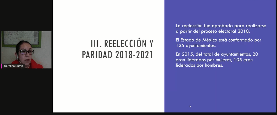 Al impartir la conferencia virtual “Reelección y paridad de género: La representación política de las mujeres en el Estado de México en las elecciones 2018-2021”, como parte de las actividades que lleva a cabo la Coordinación Institucional de Equidad de Género (CIEG) de la Universidad Autónoma del Estado de México (UAEM), la ponente compartió su análisis de cómo ha avanzado el género femenino al ocupar cargos de elección popular en las recientes elecciones municipales.