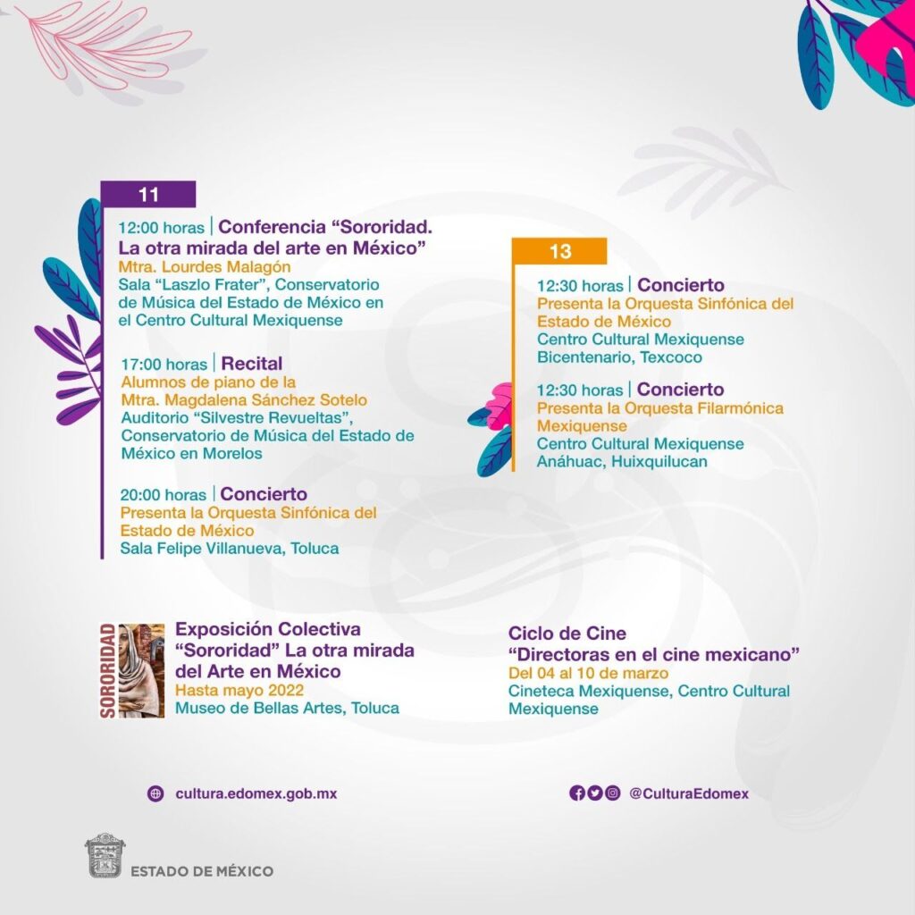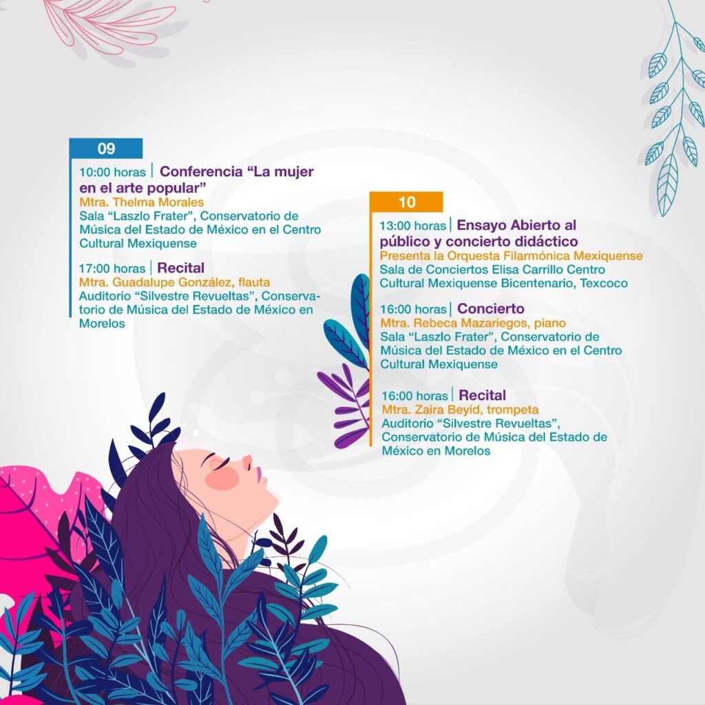 Del 7 al 13 de marzo, la jornada “Mujeres por la cultura” se realizará en distintos foros, es así que, se suma una nutrida agenda del Conservatorio de Música del Estado de México, la cual se puede consultar en @OficialCOMEM, donde habrá conferencias y conciertos.
