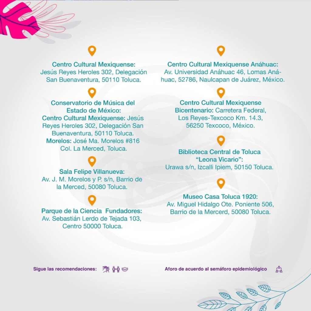 Para quienes quieran participar en estas actividades, pueden consultar la programación y direcciones por Facebook y Twitter, en @CulturaEdomex.