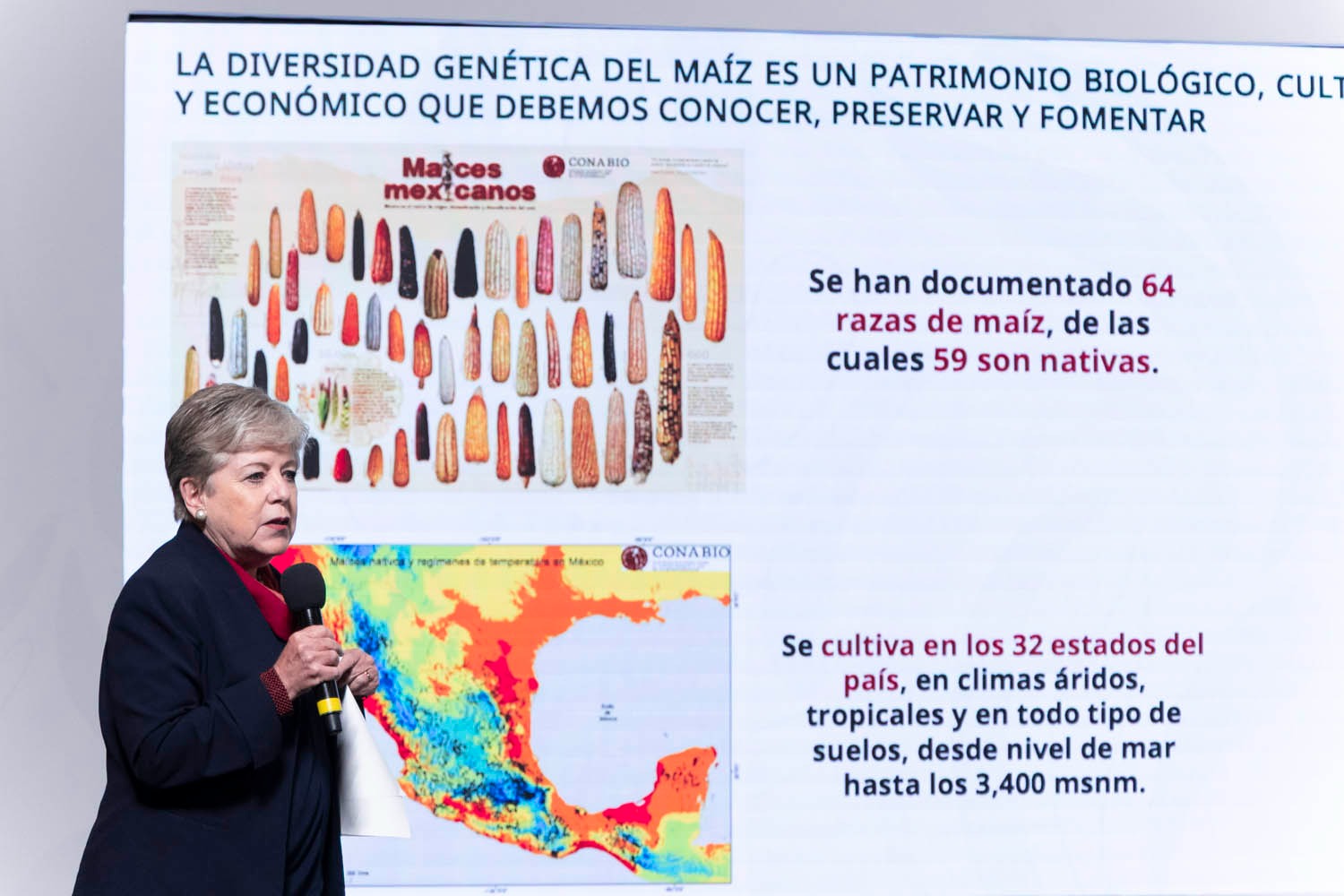 La secretaria de Medio Ambiente y Recursos Naturales, Alicia Bárcena Ibarra, destacó que en México el maíz, del que hay 64 razas y 59 son nativas de nuestro país, es identidad, seguridad alimentaria, y un símbolo de resistencia y de diversidad cultural, donde su domesticación comenzó hace 9 mil años gracias a que la manos campesinas favorecen el proceso de evolución, generando una gran diversidad genética a través de la cosecha y el intercambio de granos entre las productoras y los productores.