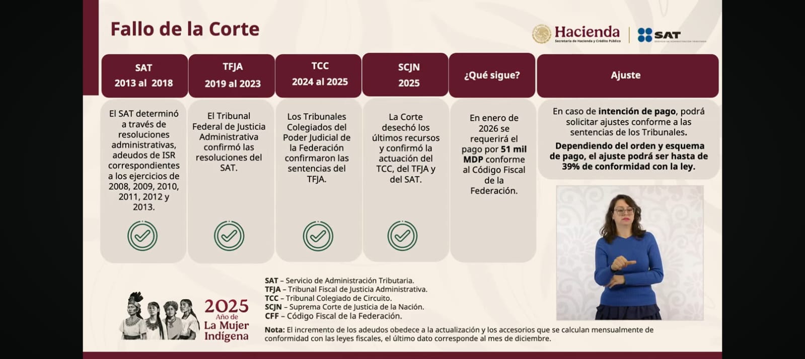 "Tras la resolución definitiva de la Corte, la autoridad fiscal tiene la obligación de continuar con el procedimiento de cobro, por lo que el mes que entra, en enero de 2026, se requerirá el pago por 51 mil millones de pesos conforme al código fiscal de la federación".