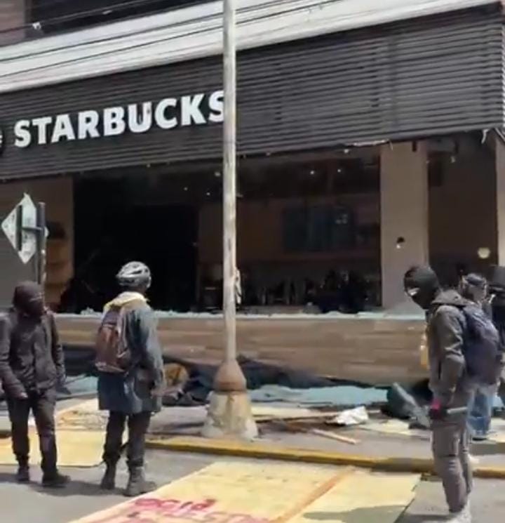 También, causaron destrozos y saquearon un café ubicado en la avenida Benito Juárez. Ahí, a pesar de que habían protegido con madera y bolsas negras, los paristas obligaron a comensales y trabajadores a salir del lugar, para posteriormente ingresar y sacar desde alimentos hasta termos, para después destrozar el lugar.