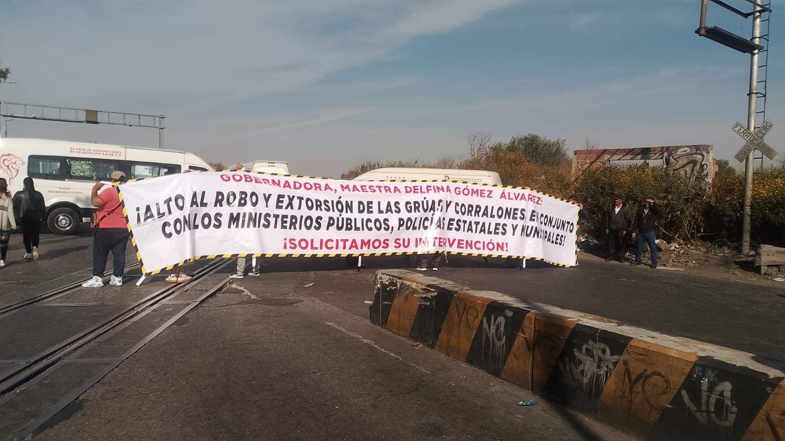 Los transportistas portaban una lona con la frase “Gobernadora, maestra Delfina Gómez Álvarez, alto al robo, extorsión de las grúas y corralones en conjunto con los ministerios públicos, policías estatal y municipal solicitamos su intervención”.